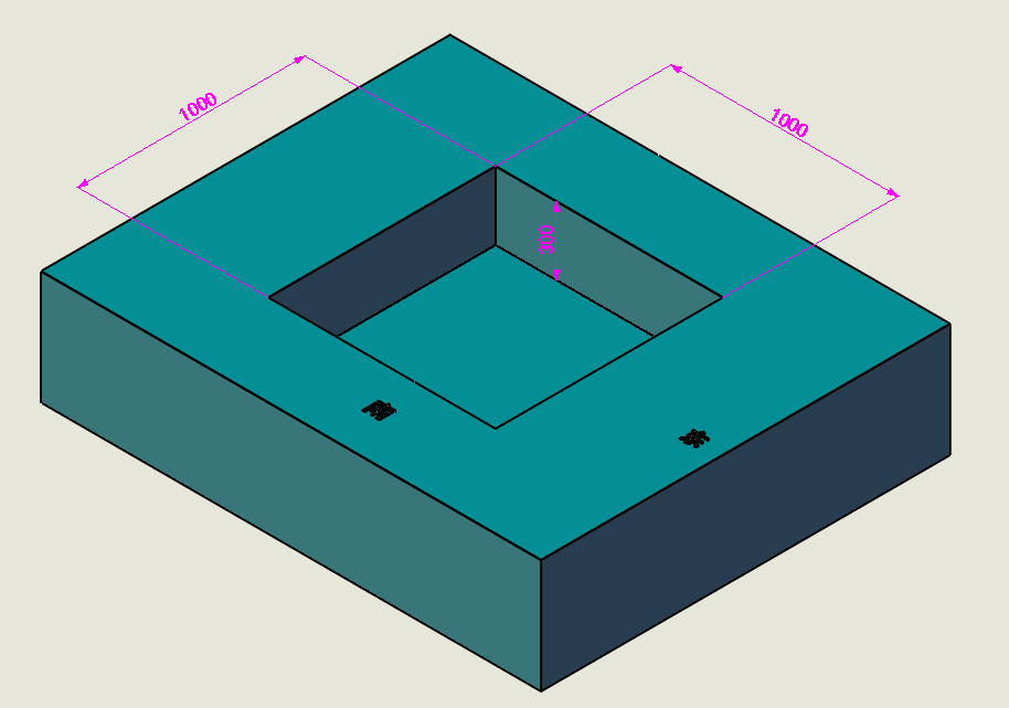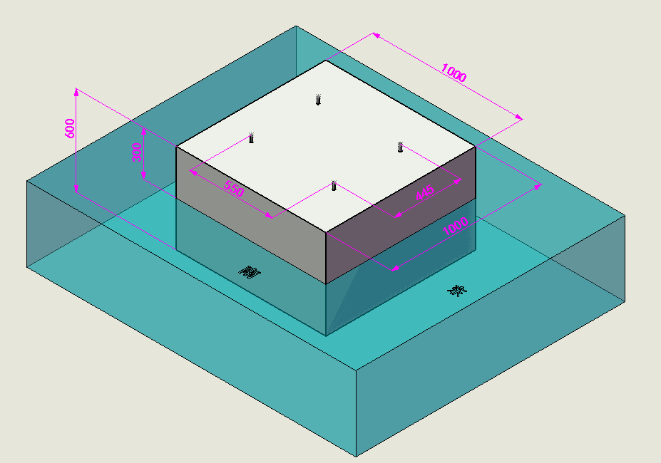 3、按下圖澆筑混凝土地基,外形尺寸(長X寬X高)=100CM*100CM*60CM,露出地面高度30CM,預埋四顆M12*120mm鐵膨脹螺栓,螺栓露出地基高度30mm左右,中心距550X445mm,需保持螺栓垂直,不能有歪斜情況。
