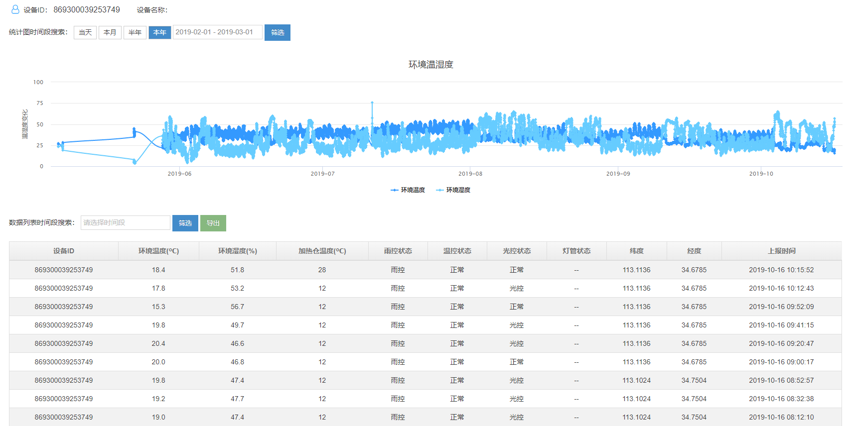4、設備可以實時顯示空氣溫度、濕度、加熱倉溫度、雨控、溫控、光控的狀態、經緯度值以及數據上報的時間。空氣溫濕度數據實時顯示,能夠以圖表和折線圖的形式展現,方便用戶結合害蟲的發生情況,更加準確的對蟲害的發生進行趨勢進行分析和預警。